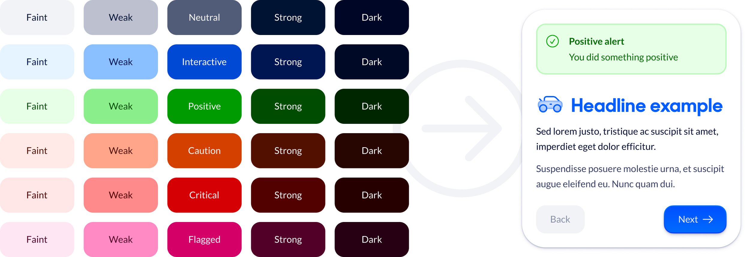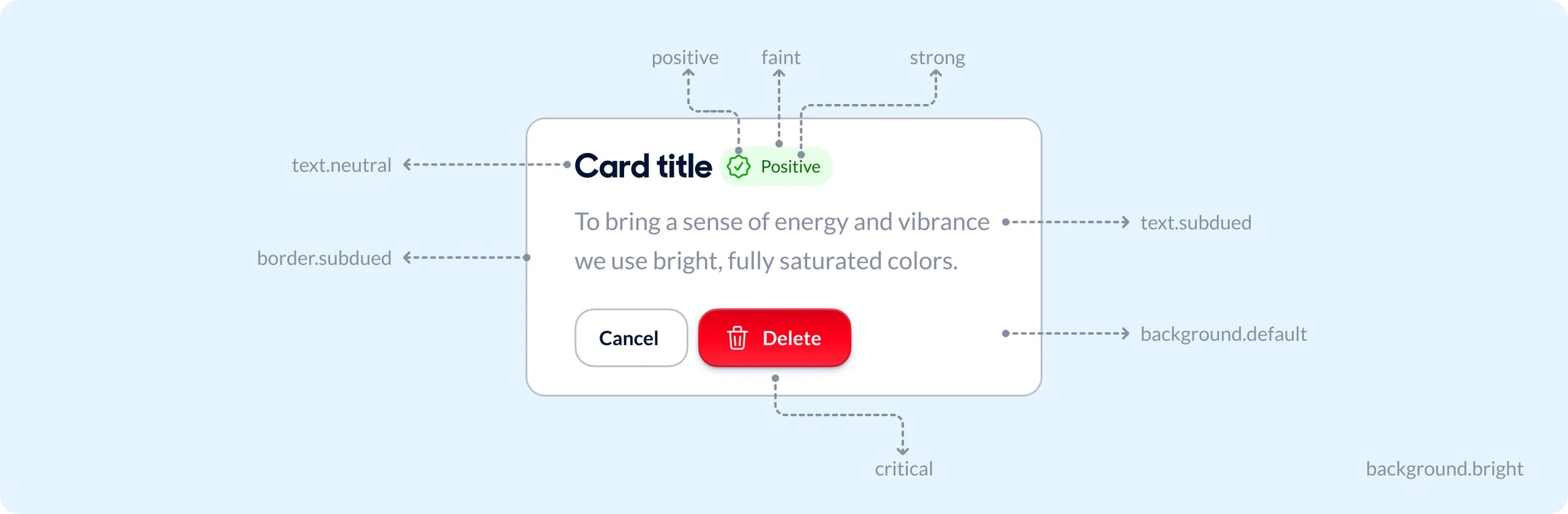 Exposing full color ramps to members of the design system team and the broader product design organization would create uncertainty about usage. To avoid that we constructed a set of abstractions to serve as shorthand for a collection of values that serve a role within each messaging tone, and that can be arranged into useful elements within components.