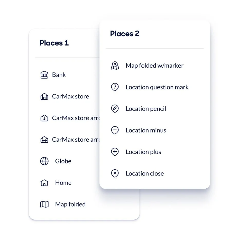 Due to the complex nature of CarMax’s business, icon needs varied widely across platforms and applications. They need to work in our physical retail stores, HR training documents, across consumer facing web products, and within associate software tools.