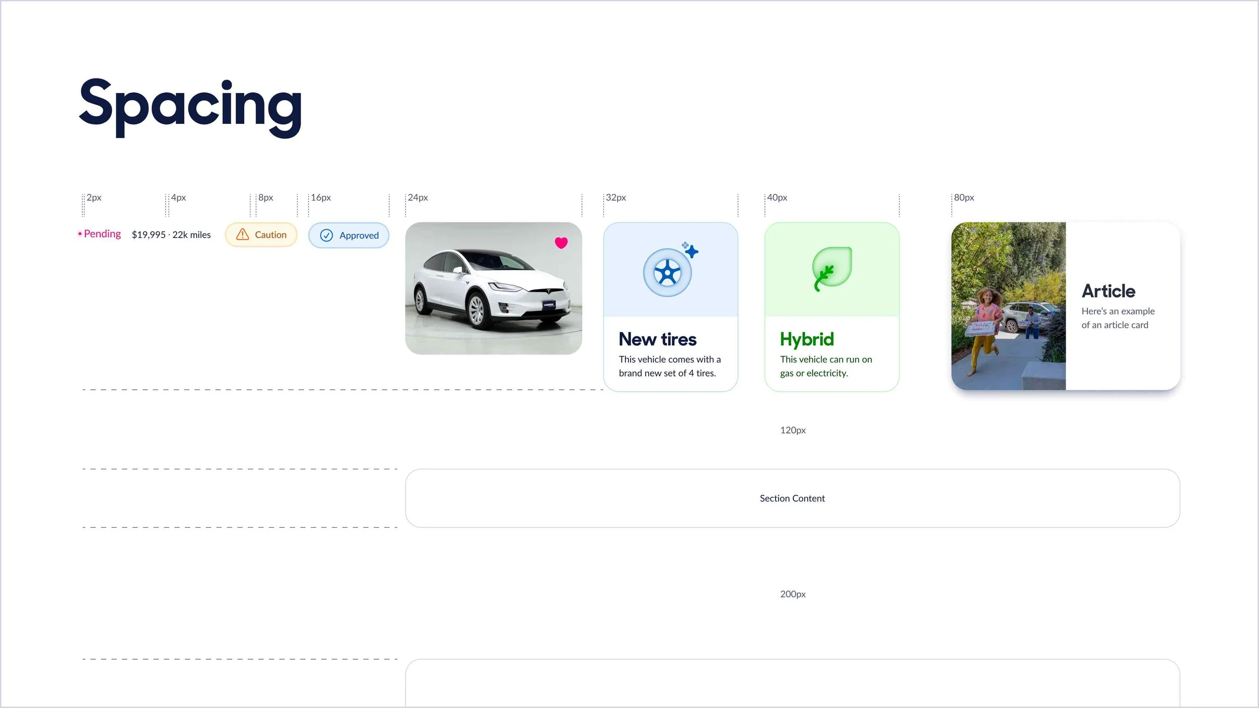 My solution was to start with our brand strategy called “Brighten The Road Ahead.” I translated the language of that brand strategy into CarMax’s first ever set of visual design principles. With a set of guiding principles in place I was able to build a visual design language around foundations and styles. The foundations included color, space, corners, typography, and icons. The styles were inspired by the industrial design of automobiles and included elevation, shapes, dimensionality, and materials.