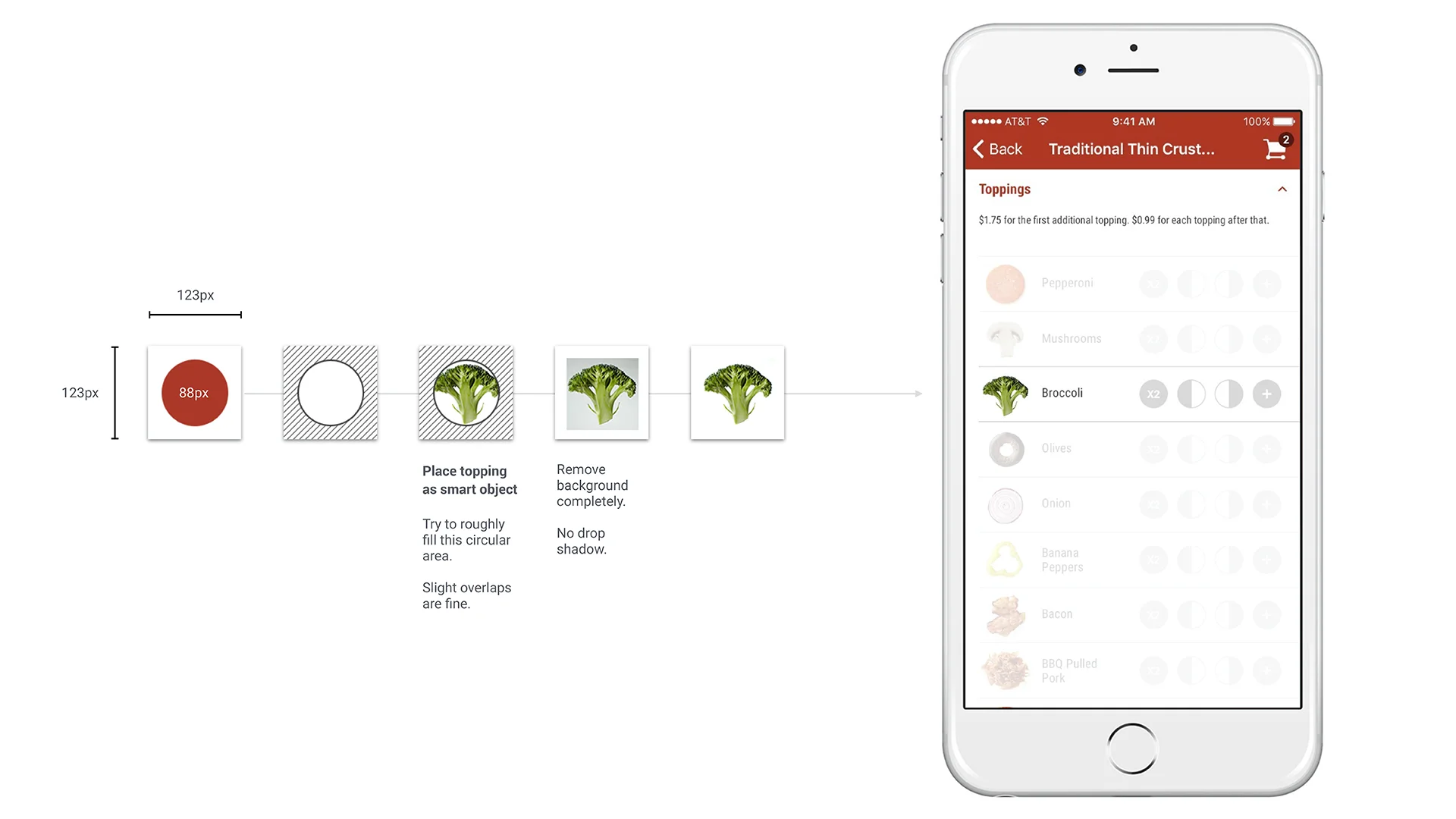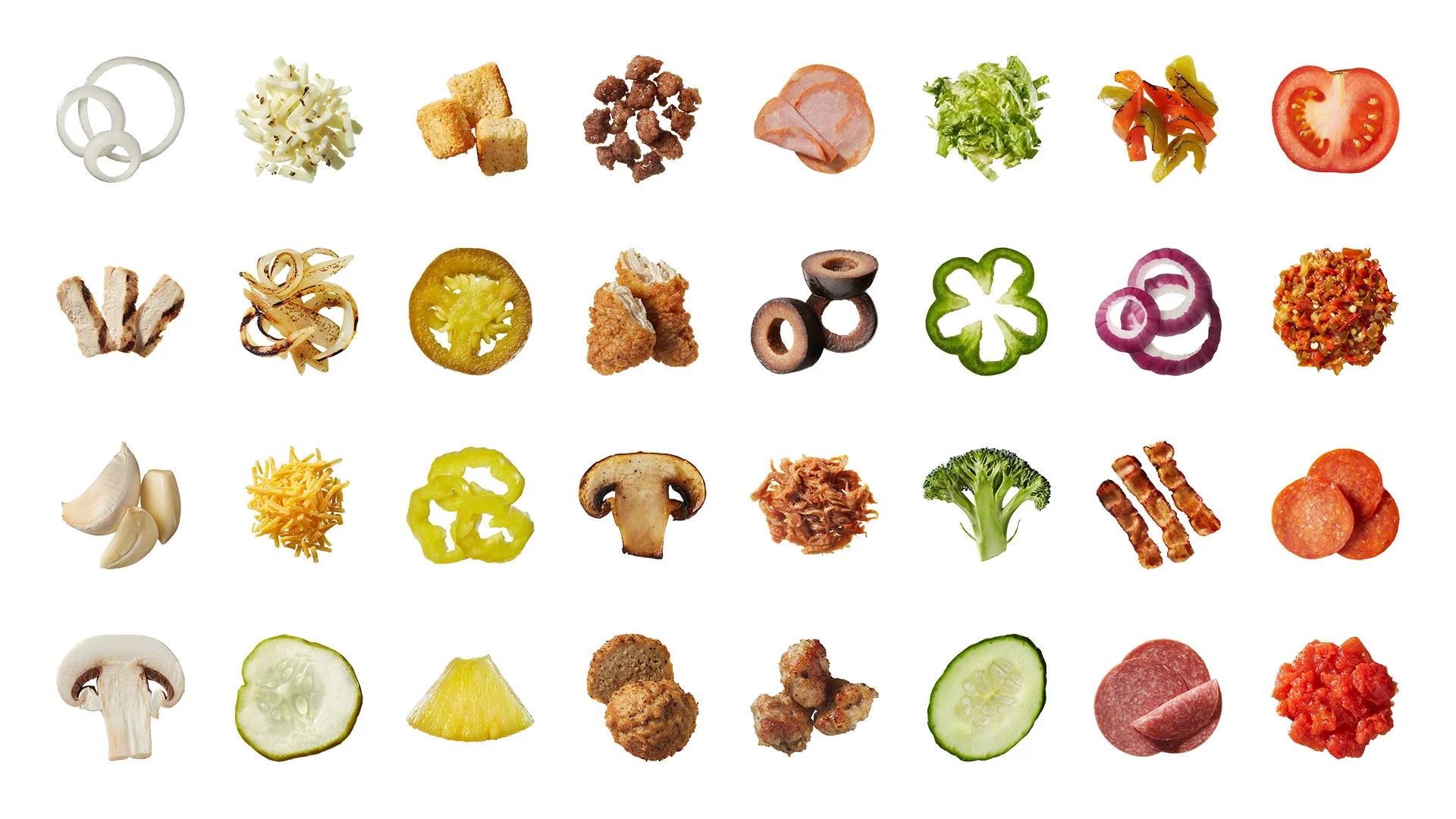 Papa Gino's customers love to build their own custom pizzas and there are a dizzying array options to choose from that vary with store location and season. Our challenge was to bring these options to life while showing the freshness of the locally sourced ingredients and the authenticity of New England specialties like hots (hot pepper relish) and Linguiça (smoked Portuguese sausage). I flew out to Boston and worked with the client's executive chef, a food stylist, and a food photographer to capture floating top down button sized portions of toppings.